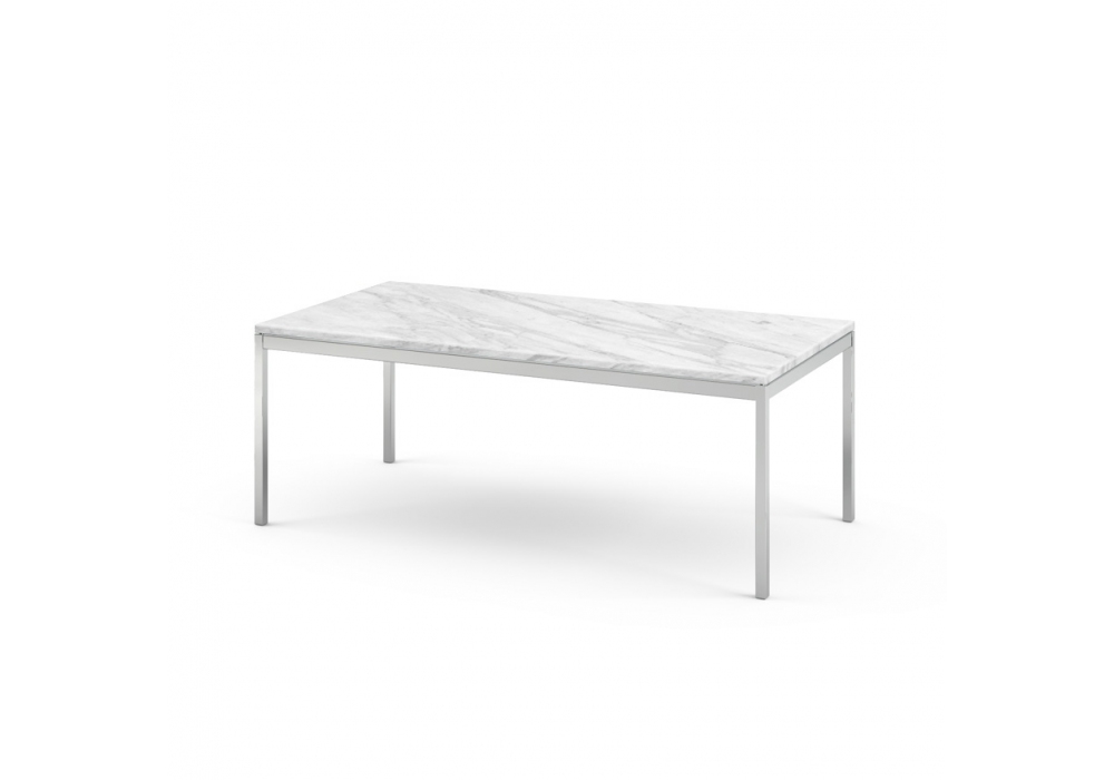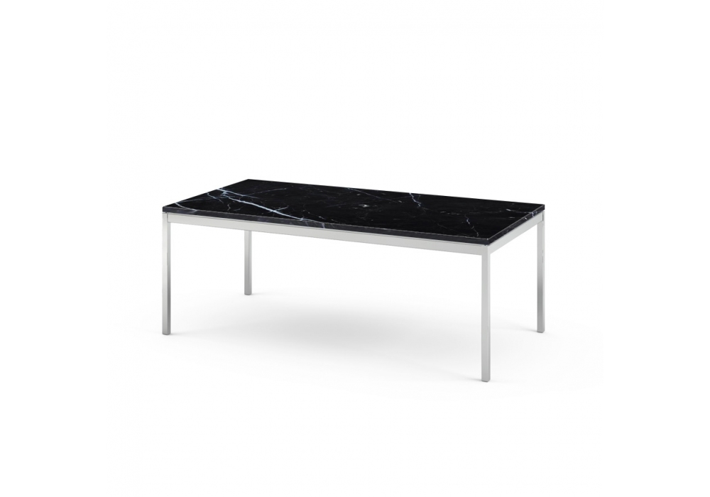 Florence von Florence Knoll für Knoll entworfen, ist ein rechteckiger Couchtisch mit einem geschweißten Stahlrahmen in poliertem Chrom oder schwarz lackiertem Finish. Platte aus Glas, Holz oder Marmor. Verfügbar in zwei Größen.