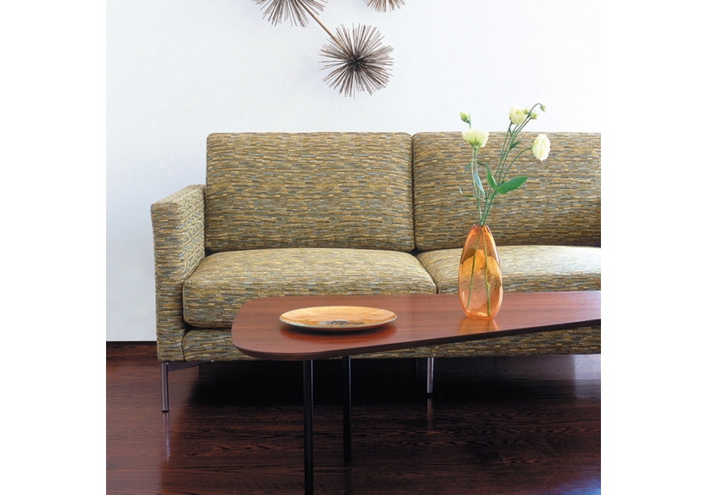Alexander Girard von Alexander Girard für Knoll entworfen, ist ein Couchtisch mit einem schwarz lackierten Metallrahmen und einer Tischplatte aus Eiche oder Walnuss mit einer 45° abgeschrägten Kante. Verfügbar in zwei Größen.