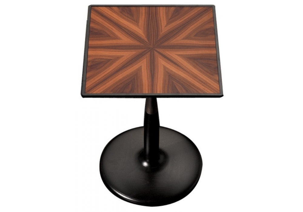 Oti is a square coffee table designed by Chi Wing Lo for Giorgetti. Coffee table with the base, column and surface moulding in solid, polished maple wood. The insert in the column is either in lathed, satin-finished nickel plated aluminum or satin-finished bronze. The inserts in the top are available in glacé crystal glass and polished pau ferro veneer with a radial pattern inlay. The base is weighted inside to guarantee stability.