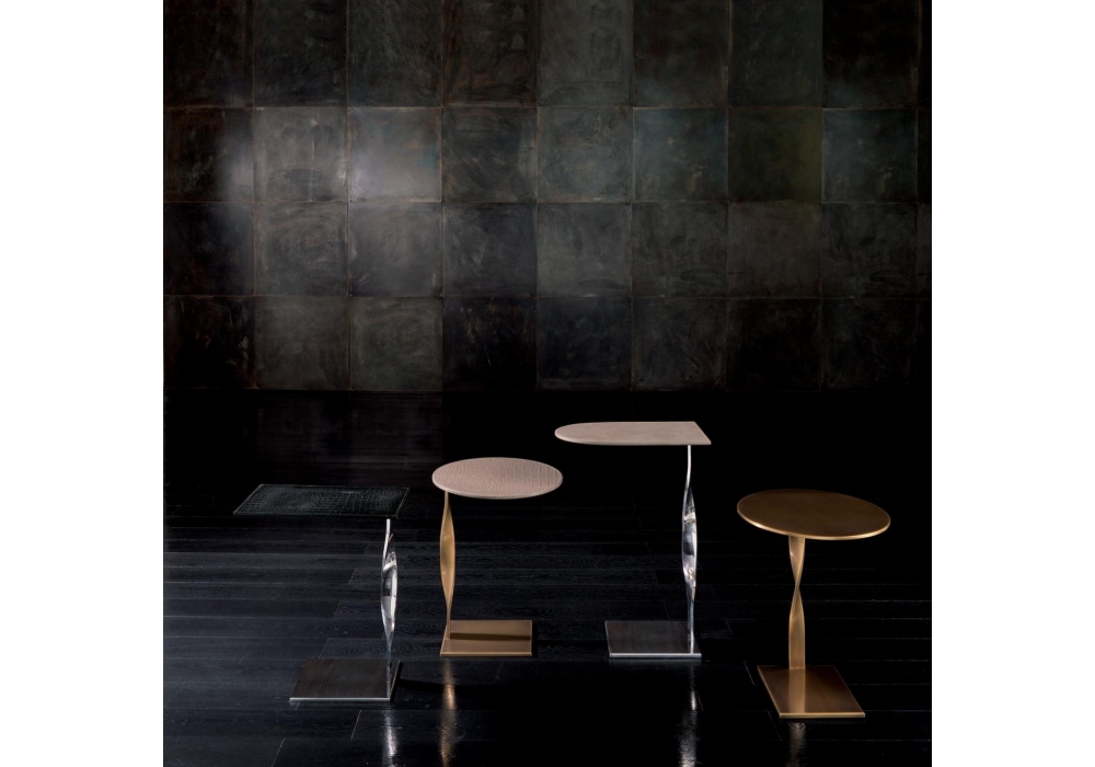 Globo von Rugiano entworfen, ist ein Couchtisch mit Tischplatte aus Leder, Messing, Marmor oder mit Dekoration bemalt. Struktur aus bronziertem oder verchromtem Messing. Erhältlich in verschiedenen Abmessungen.