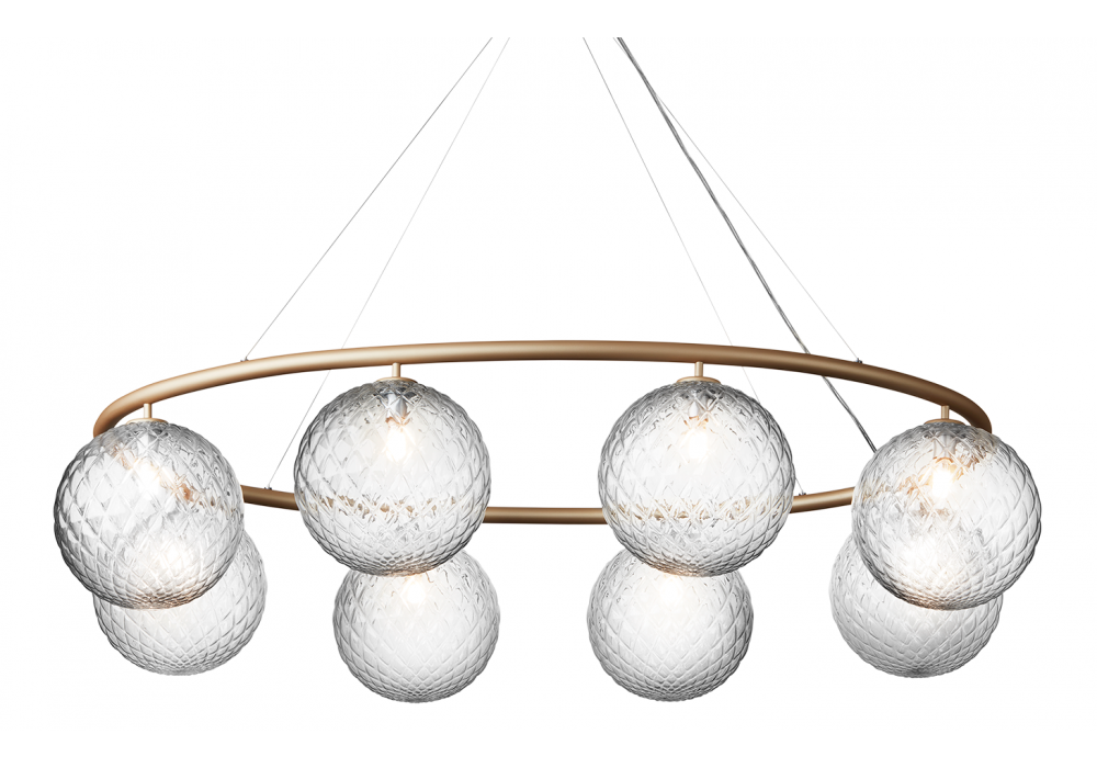 Miira 8 Oval von Sofie Refer für Nuura entworfen, ist ein Kronleuchter, der sich durch einen ovalen, pulverbeschichteten Metallring auszeichnet. Kugelförmige Diffusoren aus mundgeblasenem Opalglas oder transparentem Glas mit Reliefmotiven.