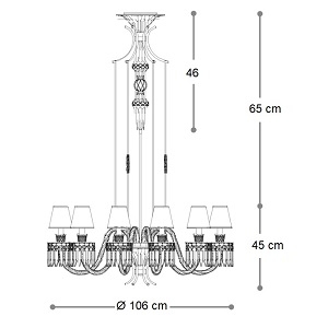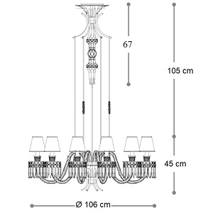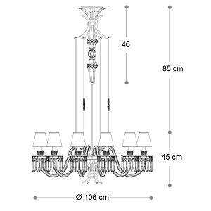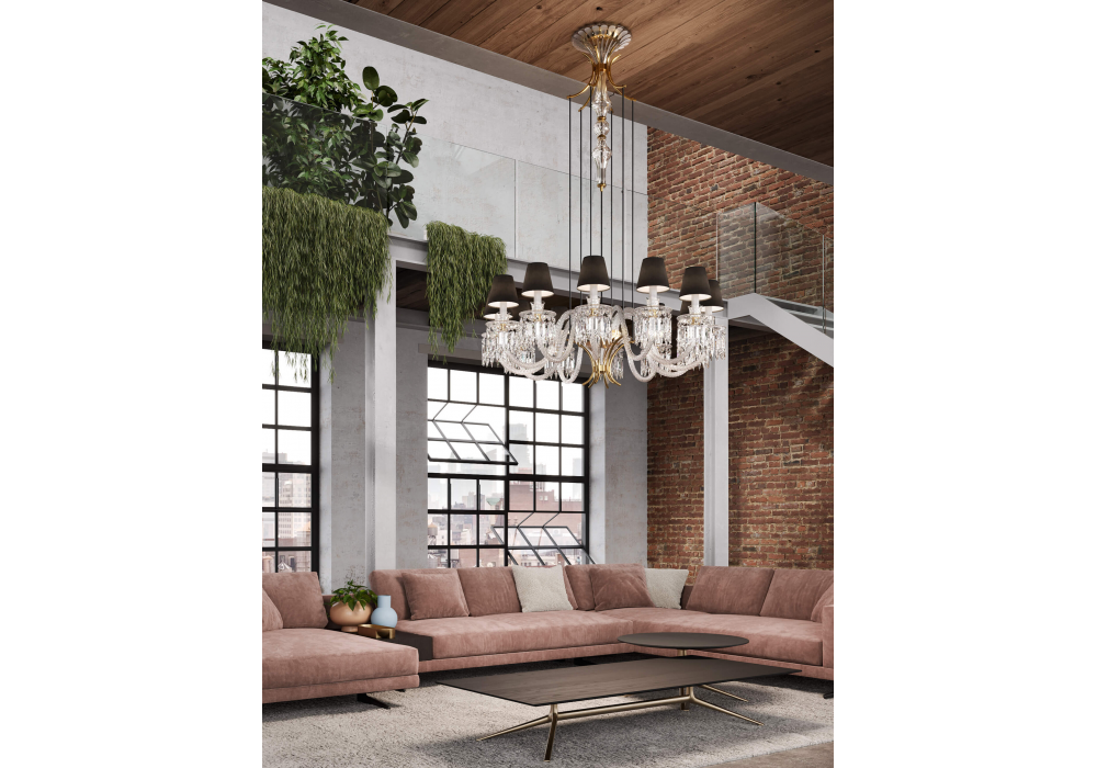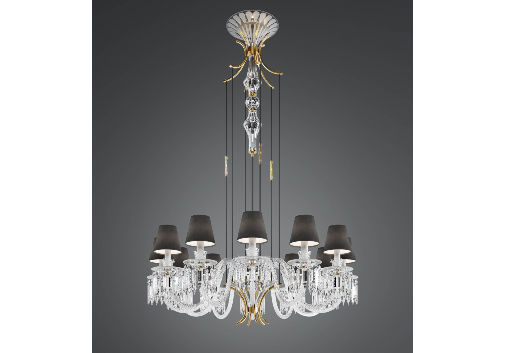 Margot von Roberta Vitadello für Italamp entworfen, ist ein Leuchter aus Kristall und Kunstglas. Lampenschirme aus Stoff in anthrazitfarbener Ausführung und mattschwarzer Metalltragstruktur. Metallische Zierdetails mit hellgoldenem Finish und Steinen.
