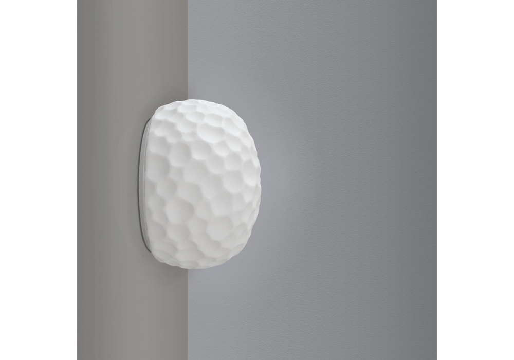 Meteorite von Pio & Tito Toso für Artemide entworfen ist eine Wand- oder Deckenleuchte mit tragender Struktur aus weißem Aluminium und Technopolymer. Der Diffusor besteht aus kugelförmigem geblasenem Glas und beherbergt eine dimmbare LED-Lichtquelle. Meteorit ist in verschiedenen Größen erhältlich.