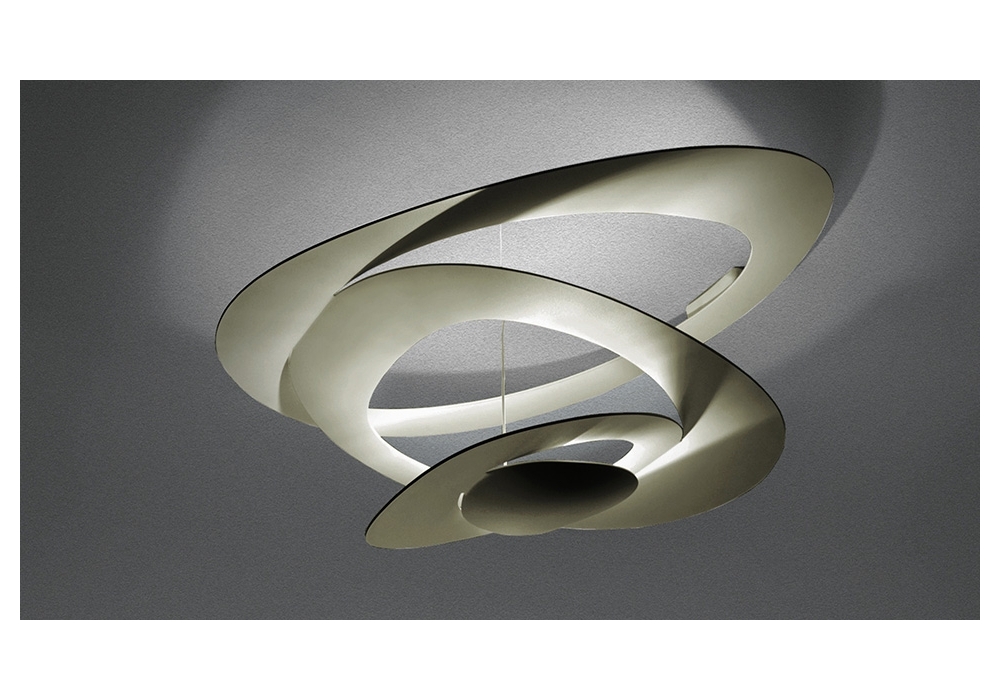 Pirce LED von Giuseppe Maurizio Scutellà für Artemide entworfen ist eine Deckenleuchte, die durch versetzte konzentrische Ringe aus lackiertem Aluminium strukturiert ist. Die Lichtquelle ist vom Typ LED mit Push-Dimmbarkeitssystem. Pirce LED ist in verschiedenen Ausführungen und Lichttönen erhältlich.