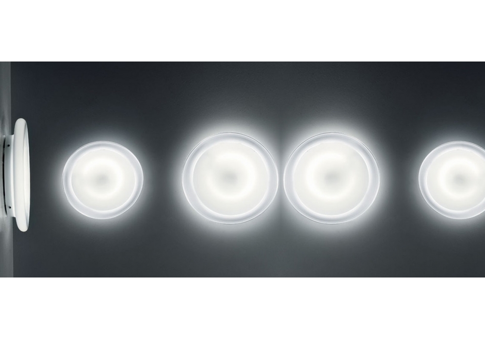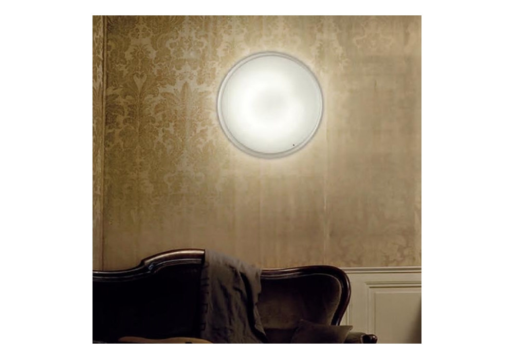 Pod von Babled & Co. für Vistosi entworfen ist eine runde Decken- oder Wandleuchte,die vollständig aus weißem Glas besteht. Die gewählte Lichtquelle ist vom Typ LED die in verschiedenen Lichtabstufungen gedimmt werden kann.