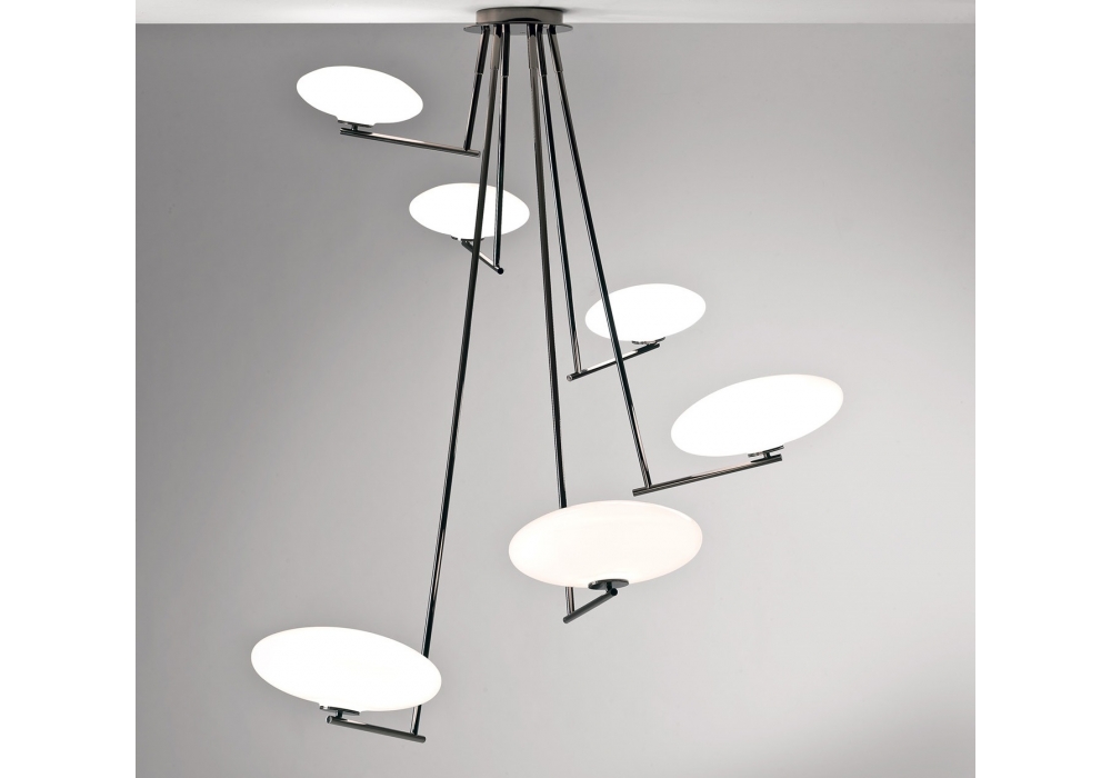 Mamì von Umberto Asnago für Penta entworfen ist eine Deckenleuchte mit graphit- oder bronzefarbener Metallstruktur. Die Diffusoren sind aus weißem mundgeblasenem Glas und nehmen eine dimmbare LED-Lichtquelle auf. Mamì ist in verschiedenen Modellen und Schattierungen der Lichtquelle erhältlich.