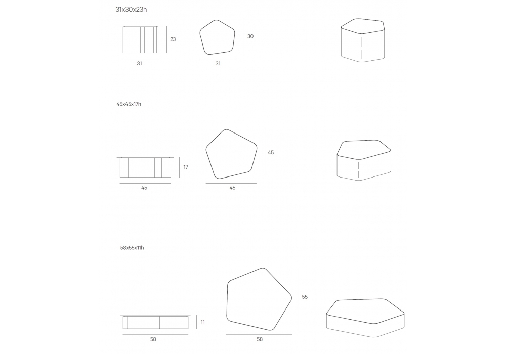 | Abmessungen | 31 x 30 x H 23 cm; 45 x 45 x H 17 cm; 58 x 55 x H 11 cm. |