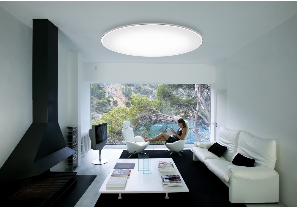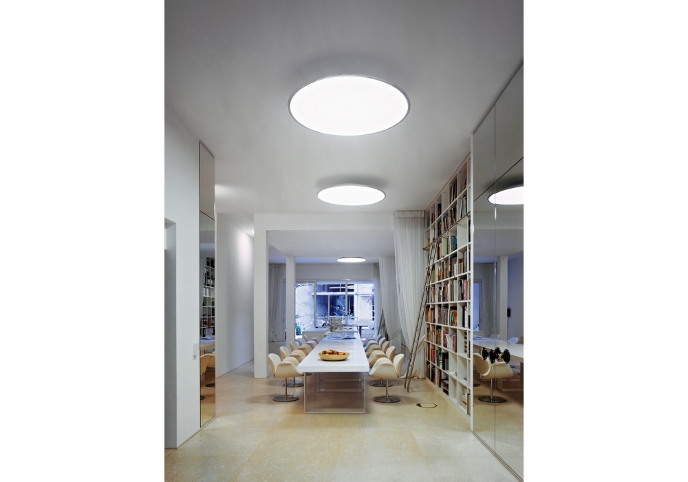 Big von Lievore Altherr, Molina für Vibia entworfen ist eine runde Deckenleuchte mit einer tragenden Struktur aus lackiertem Stahl. Der Lampenschirm besteht aus lackiertem Aluminium mit einem Methacrylat-Diffusor und verwendet LED-Lichtquellen in verschiedenen dimmbaren oder an-aus-Versionen. Big ist in verschiedenen Größen und dimmbaren Versionen erhältlich.