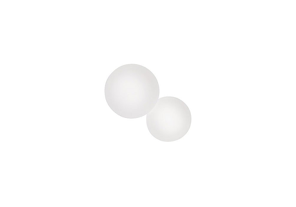Puck Two-Sphere von Jordi Vilardell für Vibia entworfen ist eine runde Wandleuchte mit einer tragenden Struktur aus weiß lackiertem Aluminium. Die Diffusoren bestehen aus mundgeblasenem Glas und schirmen die LED-Lichtquellen ab. Puck Two-Sphere ist in verschiedenen Modellen erhältlich.