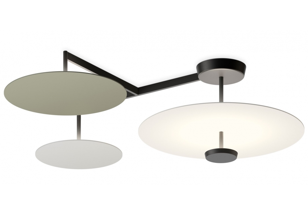 Flat 5905 entworfen von Ichiro Iwasaki für Vibia ist eine Deckenleuchte mit Aluminiumrosette und Tragstruktur aus lackiertem Stahl. Die Diffusoren sind kreisförmig geformt und aus Polycarbonat gefertigt und schirmen die dimmbaren LED-Lichtquellen ab. Flat 5905 ist in verschiedenen Ausführungen, Lichttönen und Dimmbarkeiten erhältlich.
