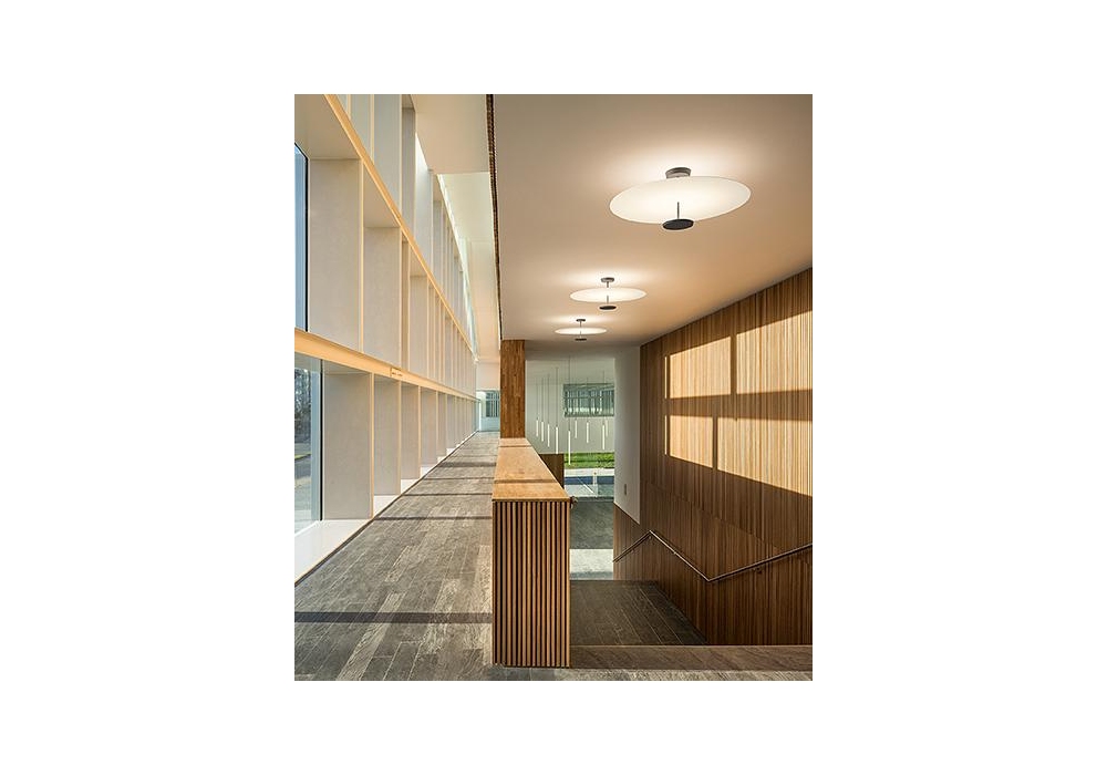 Flat 5915 von Ichiro Iwasaki für Vibia entworfen ist eine Deckenleuchte mit Aluminiumrosette und Tragstruktur aus lackiertem Stahl. Der Diffusor besteht aus einer Polycarbonatscheibe mit einem Lampenschirm aus Aluminium und nimmt dimmbare LED-Lichtquellen auf. Flat 5915 ist in verschiedenen Lichttönen und Dimmbarkeiten erhältlich.