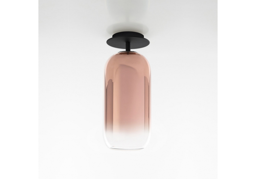 Gople von BIG - Bjarke Ingels Group für Artemide entworfen ist eine Deckenleuchte mit Rosette und röhrenförmigem Aluminiumstab. Der Diffusor hat eine zylindrische Form, besteht aus mundgeblasenem Glas und schirmt eine LED-Lichtquelle ab. Gople ist in verschiedenen Ausführungen erhältlich.