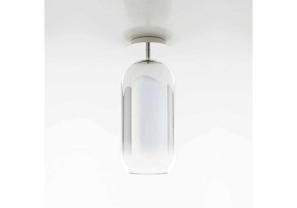 Gople Mini entworfen von BIG - Bjarke Ingels Group für Artemide ist eine Deckenleuchte mit Rosette und röhrenförmigem Aluminiumstab. Der Diffusor hat eine zylindrische Form, besteht aus mundgeblasenem Glas und schirmt eine LED-Lichtquelle ab. Gople Mini ist in verschiedenen Ausführungen erhältlich.