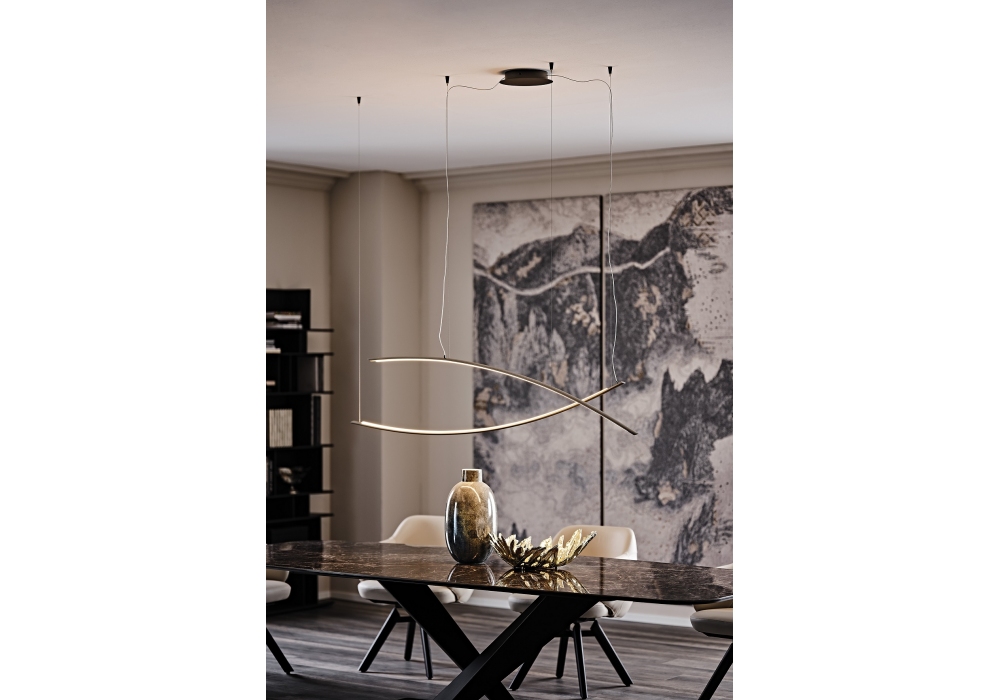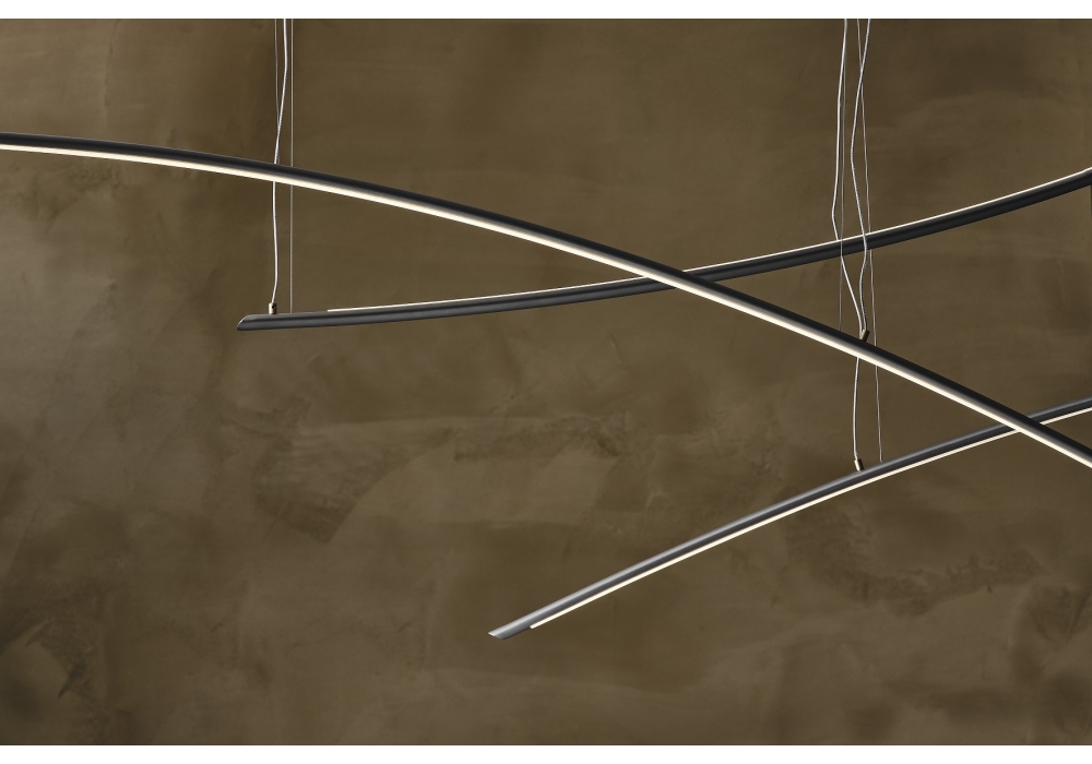 Katana, von Giorgio Cattelan für Cattelan Italia entworfen, ist eine LED-Deckenleuchte mit Metallgestell lackiert titan gaufriert. Verfügbar mit Fernbedienung und Dimmer.