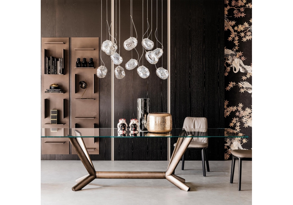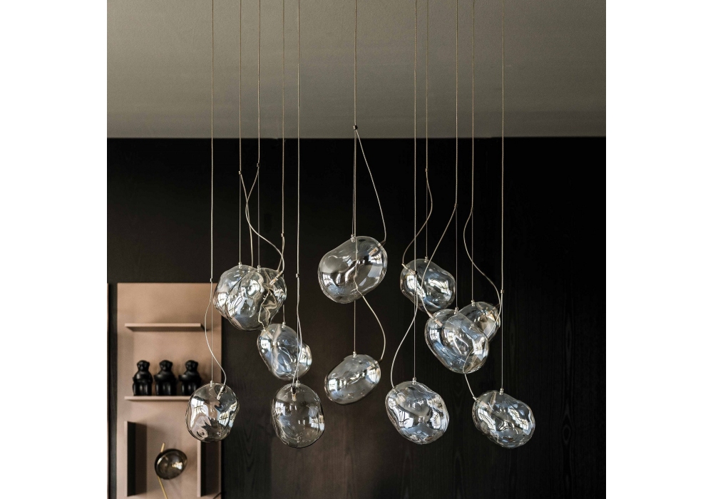 Cloudine, von Oriano Favaretto für Cattelan Italia entworfen, ist eine Deckenleuchte mit Lampenschirm in Kristall Iride oder fumé. Anschluss aus schwarz verchromtem Stahl.