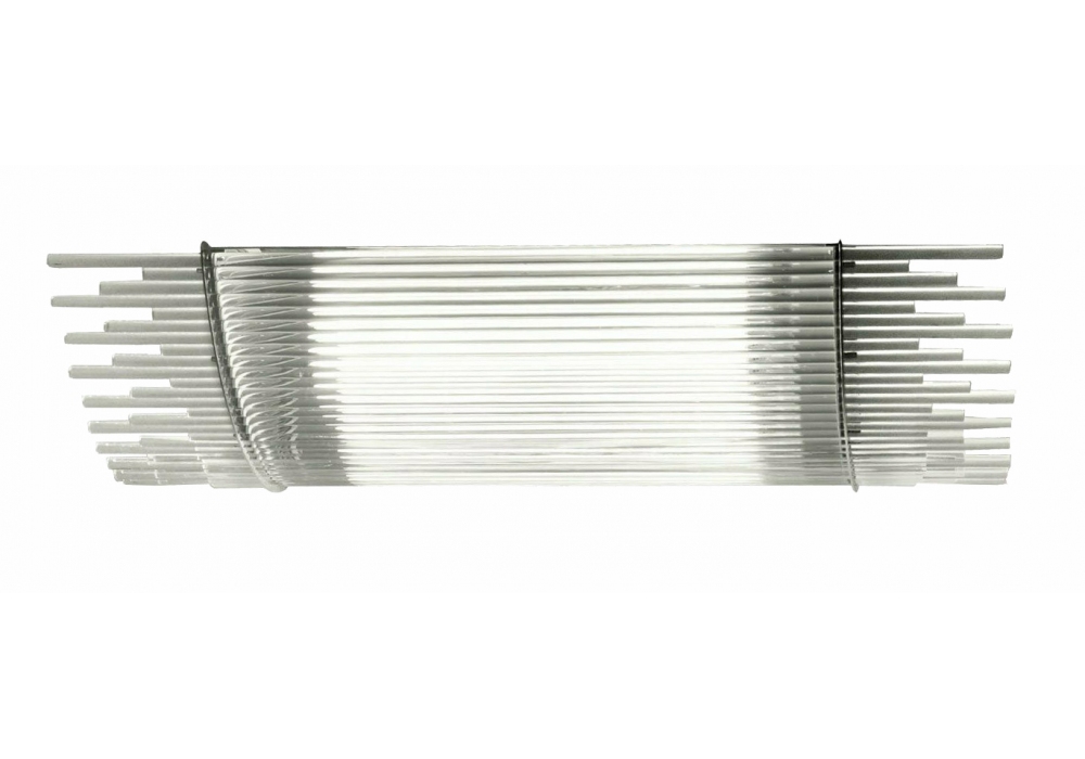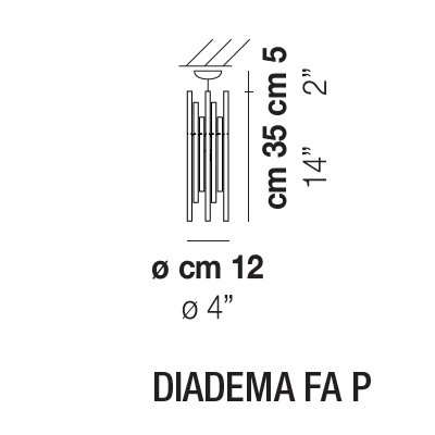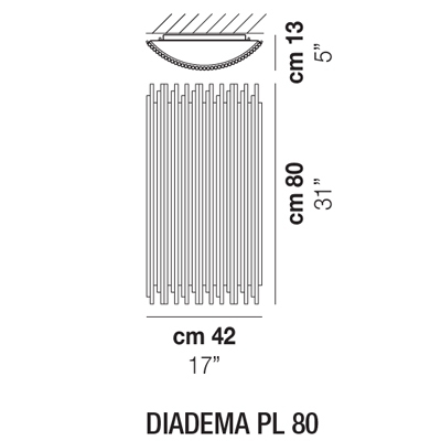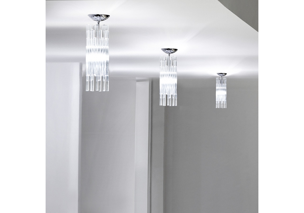 Diadema von Romani Saccani Architetti Associati für Vistosi entworfen ist eine Deckenleuchte mit tragender Struktur aus lackiertem Metall. Der Diffusor ist durch eine Reihe von nebeneinander angeordneten röhrenförmigen Kristallelementen strukturiert und nimmt eine Lichtquelle mit R7S- oder G9-Anschluss des LED- oder dimmbaren Halogentyps auf. Diadema ist in zwei verschiedenen Ausführungen erhältlich.