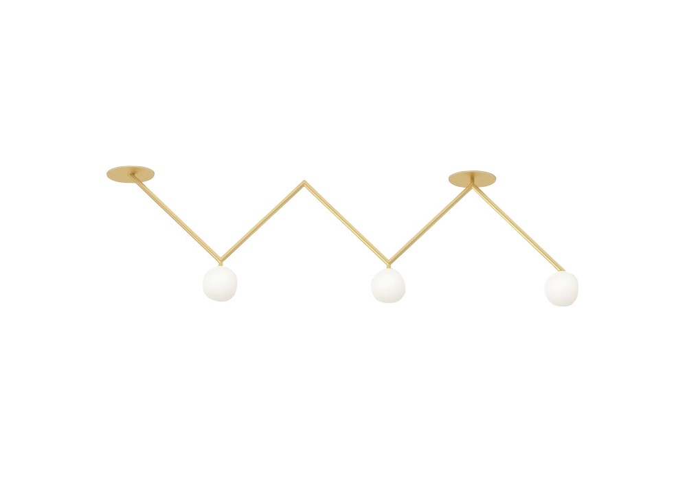 Zigzag von Atelier Areti entworfen, ist eine Deckenleuchte aus gebürstetem Messing und weißen Glasdiffusoren.