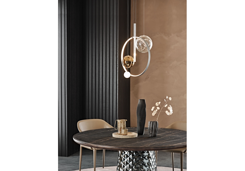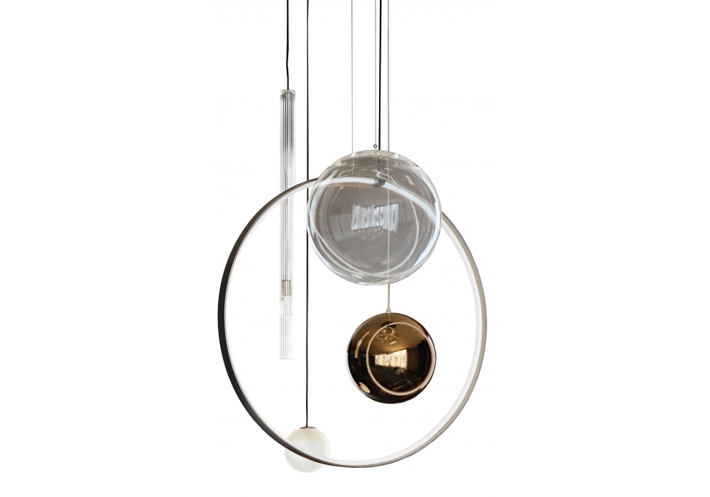 Biarritz von Oriano Favaretto für Cattelan Italia entworfen, ist eine Deckenleuchte mit Lampenschirm aus sandgestrahltem Borosilikatglas transparent und bronze. Stahlgestell lackiert iron grey satiniert. Stiel aus geriffeltem Borosilikatglas. Deckenbefestigung aus Stahl lackiert titan gaufriert.