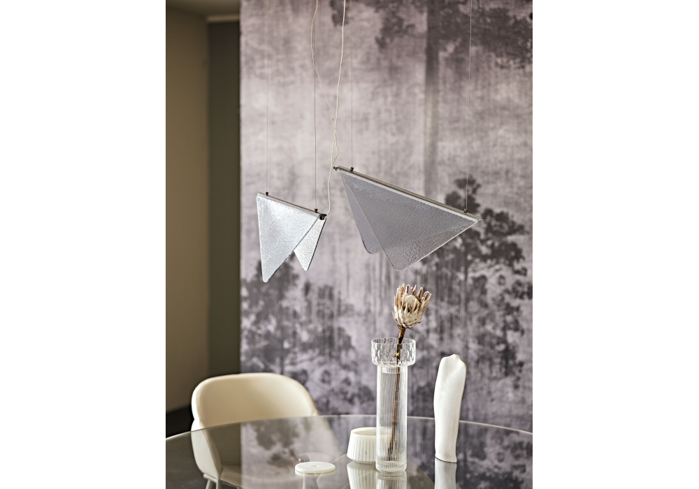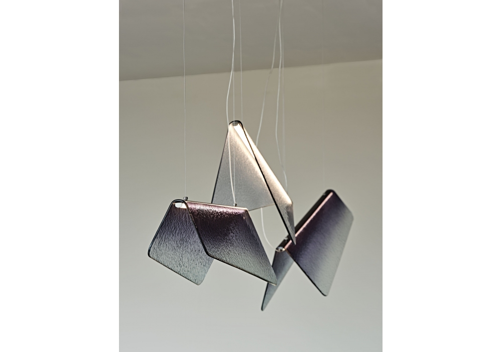Velar, von Carlo Rocchetti für Cattelan Italia entworfen, ist eine LED-Deckenleuchte mit Lampenschirm aus kunstvoll verziertem Glas, transparent oder blau fumé. Deckenplatte Stahl schwarz verchromt.