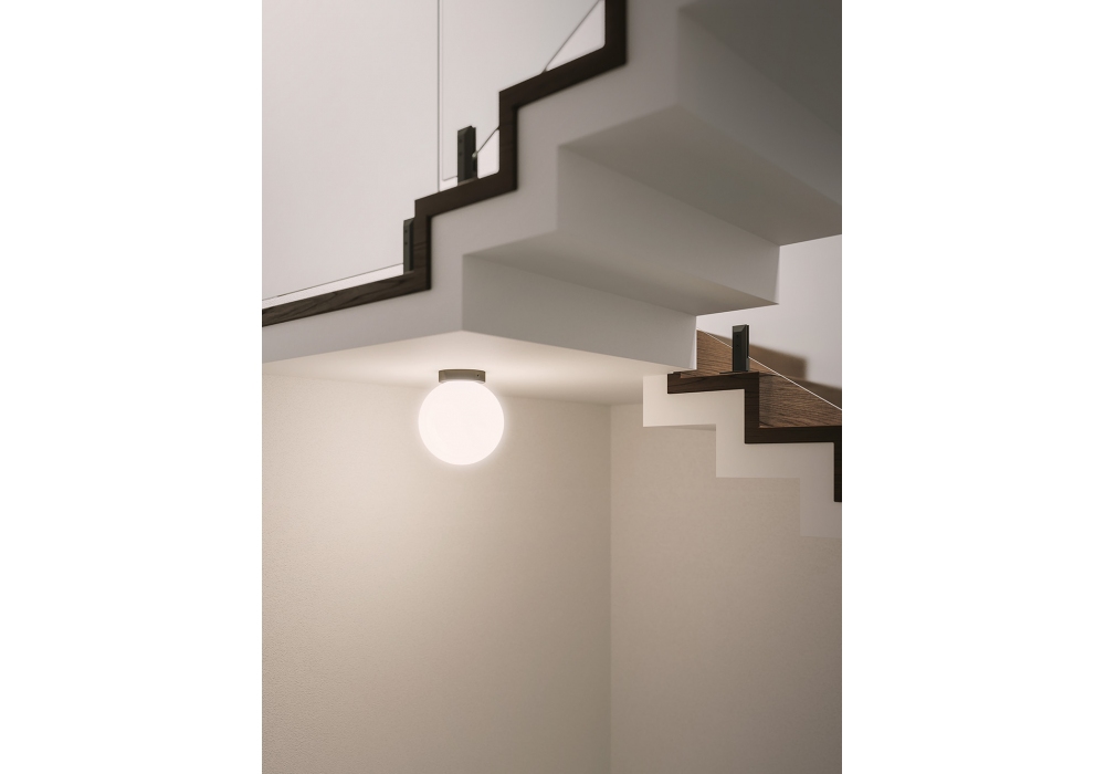 Asteroide, entworfen und hergestellt von Nemo, ist eine Deckenleuchte mit Halterung aus verchromtem Aluminium. Der Diffusor ist kugelförmig aus satiniertem, opalweißem, mundgeblasenem Triplex-Glas. Das verwendete Leuchtmittel ist mit dimmbarem E14-Stecker.
