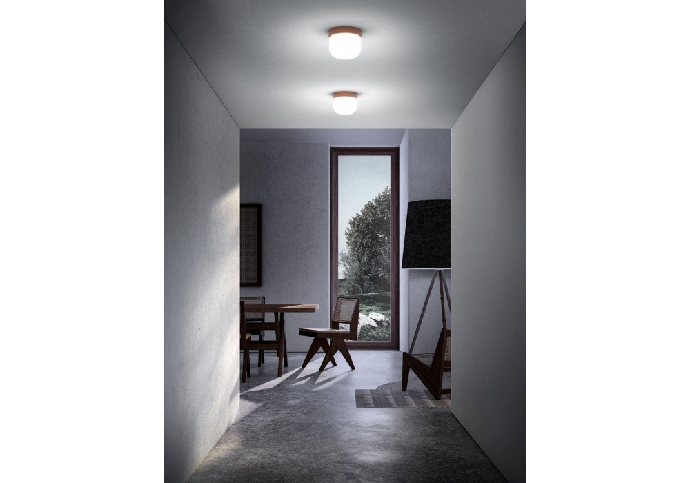 Delux von Studio Natural und Emiliana Martinelli für Martinelli Luce entworfen, ist eine runde Deckenleuchte aus lackiertem Aluminium. Der Diffusor besteht aus opalweißem mundgeblasenem Glas und schirmt eine integrierte LED-Lichtquelle ab. Delux ist in verschiedenen Ausführungen erhältlich.