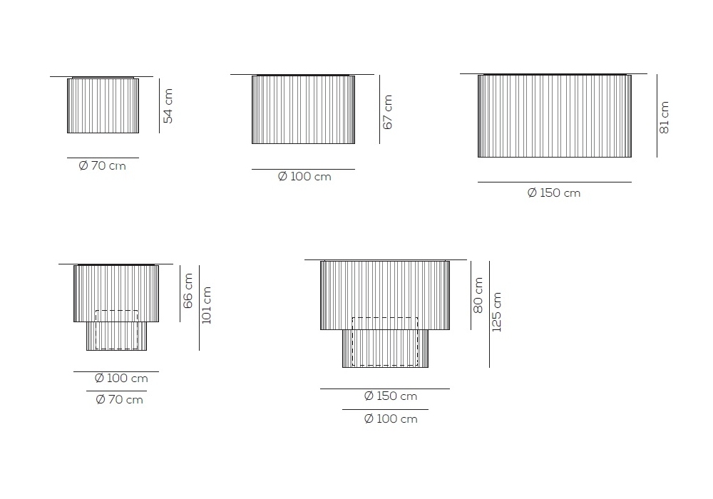 | Abmessungen | • Ø 70 x H 54 cm; • Ø 100 x H 67 cm; • Ø 150 x H 81 cm; • Ø 70/100 x H 66/101 cm; • Ø 100/150 x H 80/125 cm |