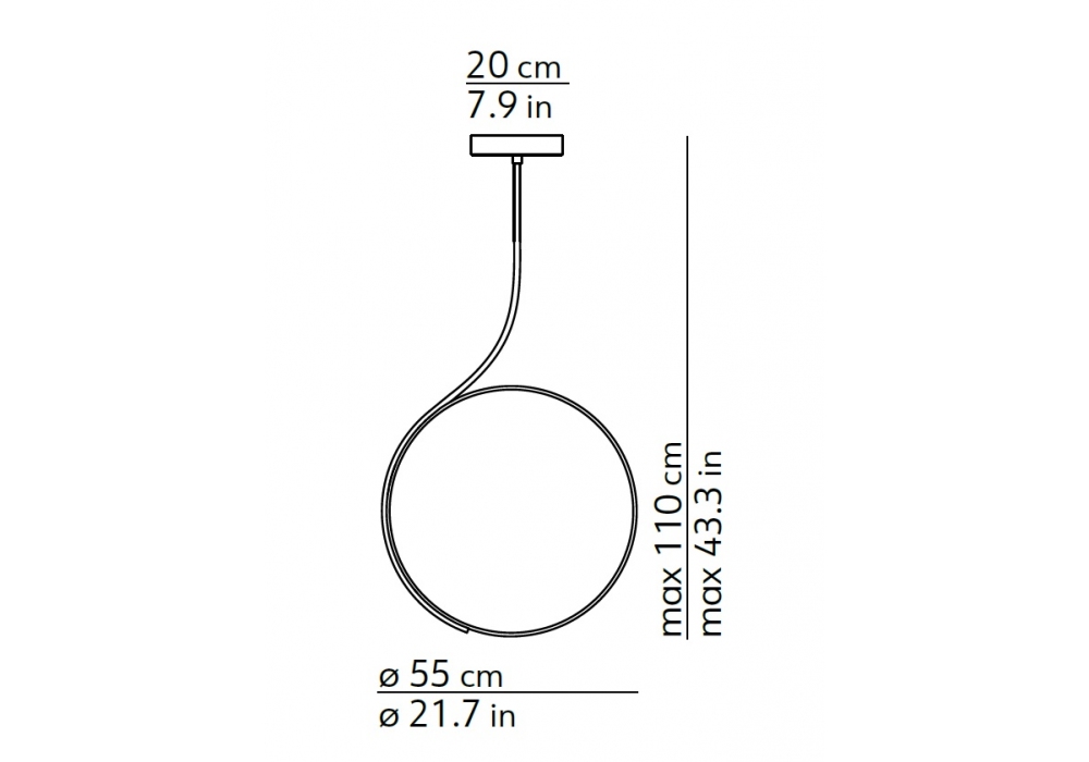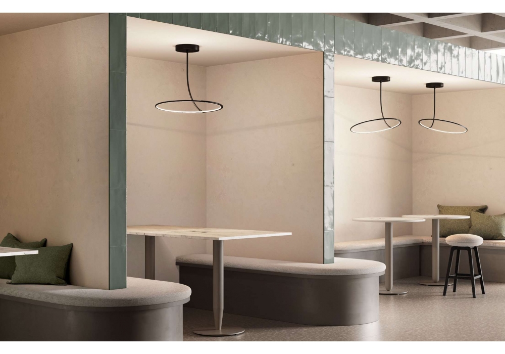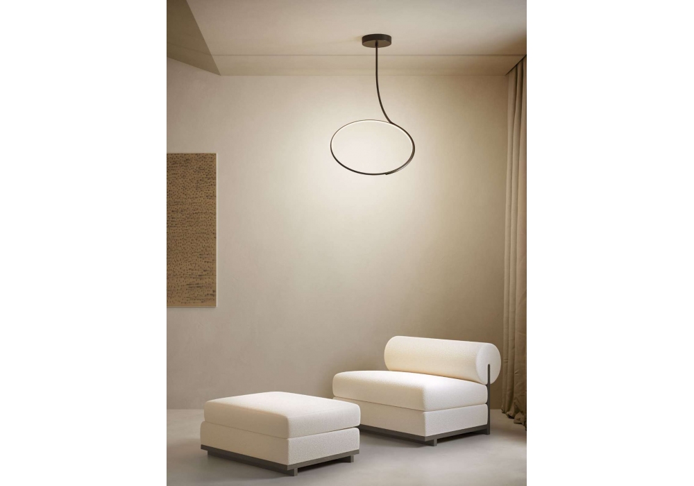 Poise, von Robert Dabi für Kundalini entworfen, ist eine Deckenleuchte mit flexiblem Schlauch, der mit technischem Stoff überzogen ist, Diffusor und Struktur aus mattschwarzem Metall. Dank des flexiblen Abschnitts zwischen der Stange und dieser ist es möglich, den Diffusorring zu bewegen.