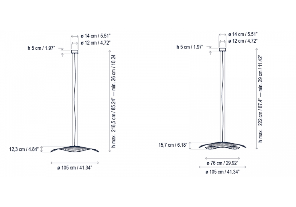 | Abmessungen | Ø 105 x H 12,3 cm Hmax 216 cm; Ø 105 + Ø 76 x H 15,7 cm Hmax 222 cm. |