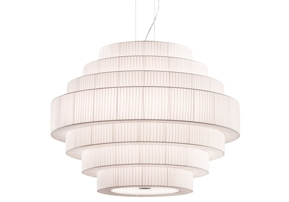 Mos von Joana Bover für Bover entworfen ist eine Hängeleuchte mit Stütze und tragender Struktur aus lackiertem Metall. Der Lampenschirm ist in konzentrischen Stoffkreisen strukturiert, mit einem unteren optischen Glasdiffusor und einer Abschirmung der LED-Lichtquellen. Mos ist in verschiedenen Modellen erhältlich