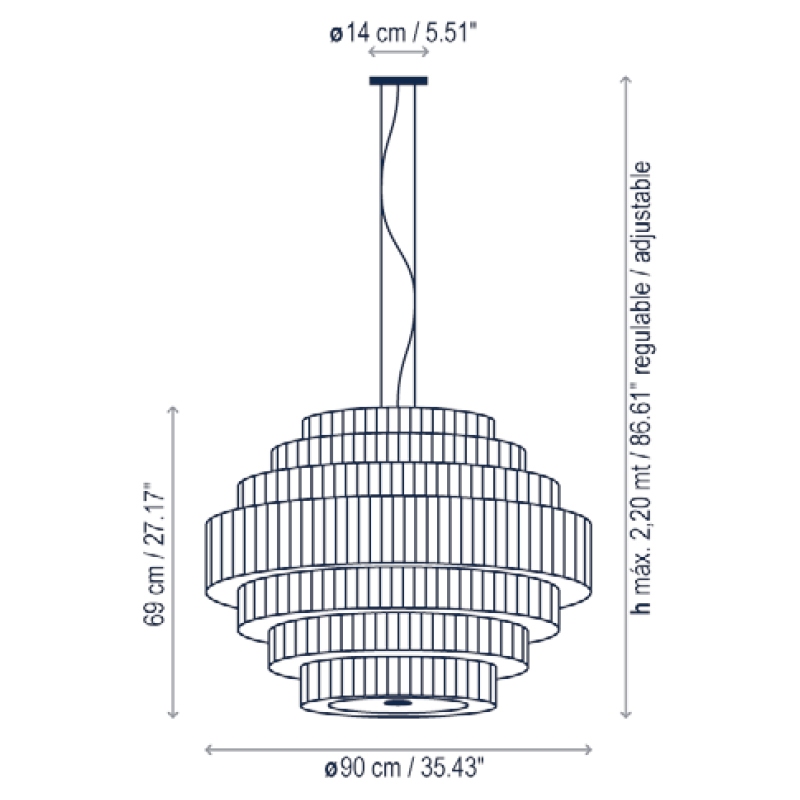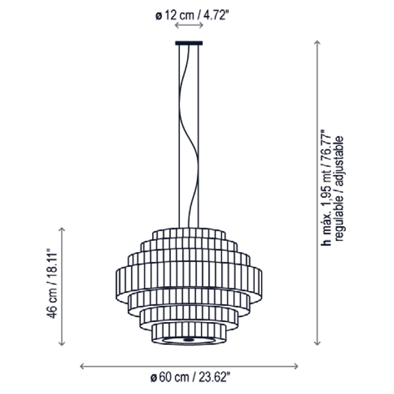 | Abmessungen | Ø 60 x H 46 cm Hmax 195 cm; Ø 90 x H 69 cm Hmax 220 cm; Ø 120 x H 92 cm Hmax 220 cm. |