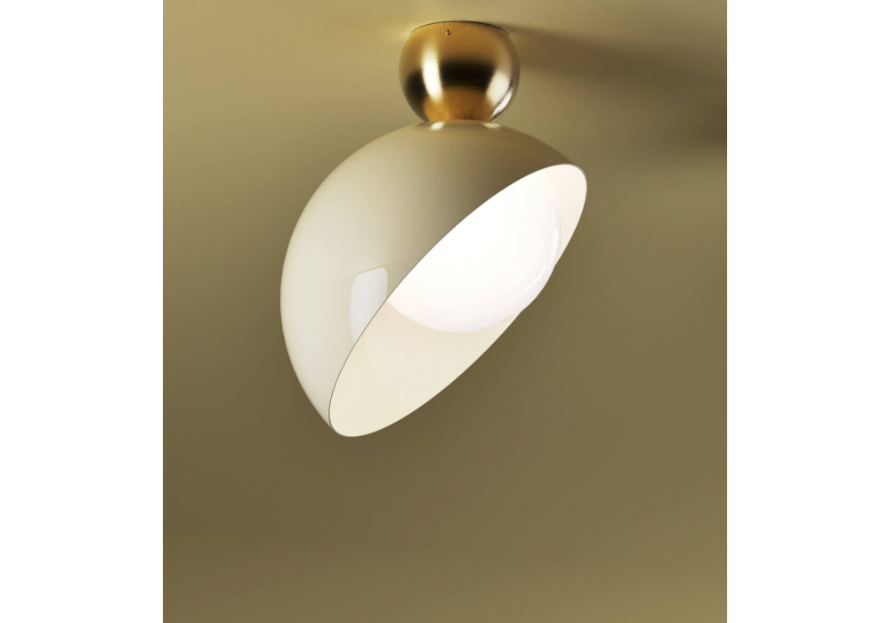 Aurora von Virginia Cei für Italamp entworfen, ist eine LED-Deckenleuchte aus lackiertem Metall und einer zentralen Kugel in gebürstetem Hellgold. Der Diffusor besteht aus weißem Glas.