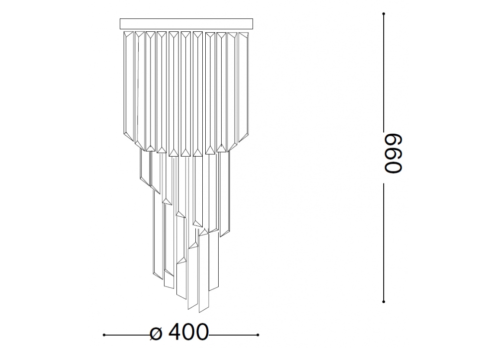 Carlton SP8 entworfen und hergestellt von Ideal Lux ist eine Deckenleuchte mit chromfarbener Metalltragstruktur. Die Anhänger sind transparente Kristallstäbe, die von achteckigen Ketten gehalten werden, die am runden Rahmen verankert sind. Die verwendeten Lichtquellen sind vom Typ LED.