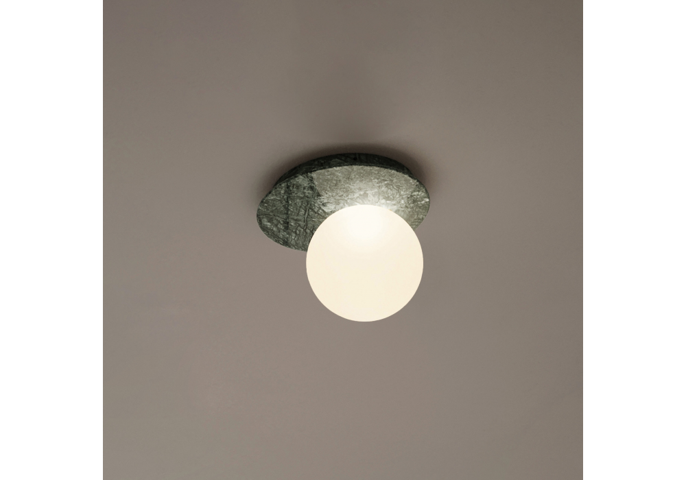 Emma von Contardi Studio entworfen, ist eine Deckenleuchte mit einem zylindrischen Korpus aus Marmor. Der kugelförmige Diffusor besteht aus opalweißem Glas und beherbergt eine G9-LED-Lichtquelle.