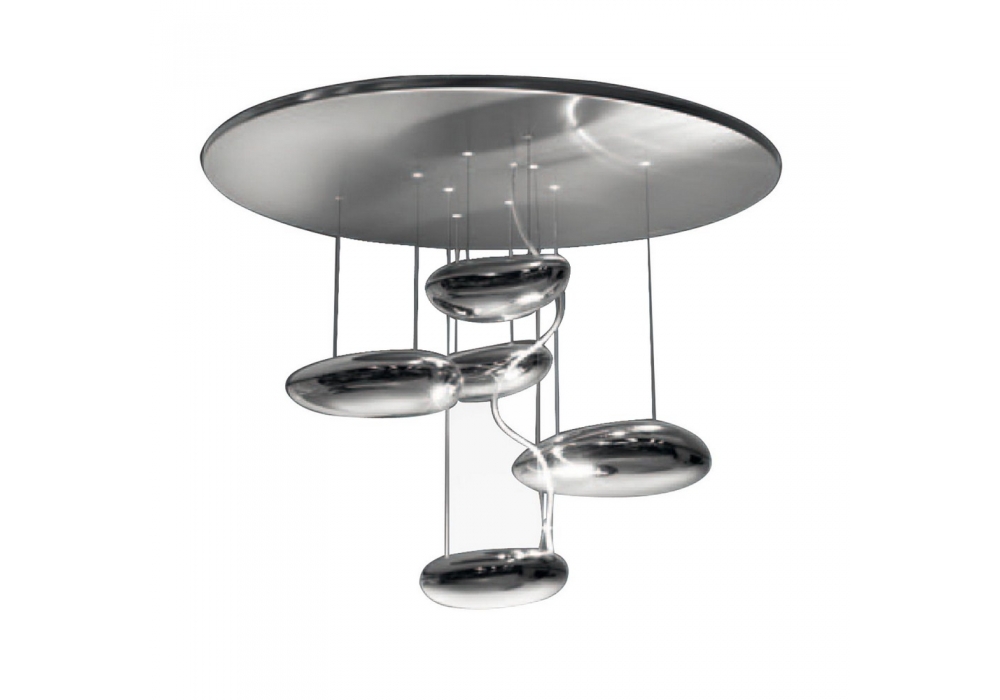 Mercury Mini von Ross Lovegrove für Artemide entworfen ist eine Deckenleuchte mit kreisförmiger Aluminium-Verankerungsplatte. Die Diffusoren sind schwebende Kieselsteine mit LED-Lichtquellen mit Push-Dimmbarkeitssystem. Mercury ist in verschiedenen Lichtquellenversionen erhältlich.