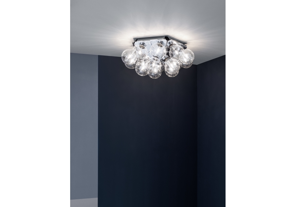 Taraxacum 88 C/W von Achille & Pier Giacomo Castiglioni für Flos entworfen, ist eine Wand-/Deckenleuchte mit direktem und reflektiertem Licht. Die Struktur besteht aus fünf Dreiecken aus poliertem, bedrucktem Aluminium. 15 transparente Globolux-Glühbirnen sind in der Struktur untergebracht. Wand-/Deckenbefestigung und Stahlrosette. Ferngesteuert regulierbar (Dimmer nicht im Lieferumfang enthalten). Leuchtmittel im Lieferumfang enthalten.