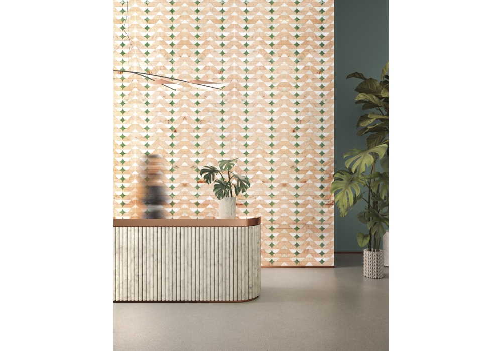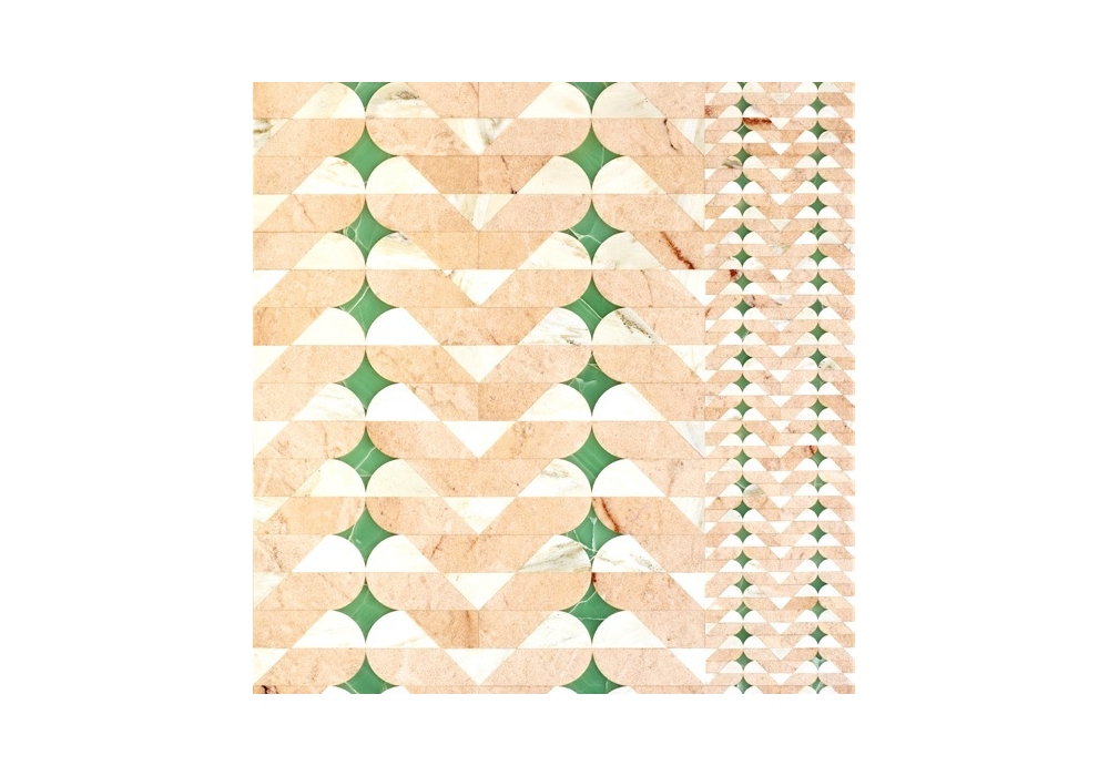 Amelie von Patricia Urquiola für Budri entworfen, ist ein dekoratives modulares Wand- oder Bodenplatte aus Lachsrosa von Portugal, Estremoz Pink von Portugal und Onyx Verde Aquarel Marmor.