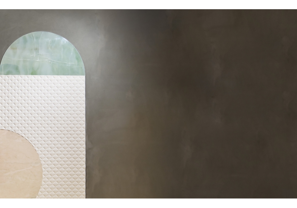 Aquarel von Patricia Urquiola für Budri entworfen, ist ein dekoratives Wandpaneel mit Oberflächen mit geometrischen Linien und Kamm- und Metalassé-Texturen, die die verwendeten Marmore hervorheben: Azul Macauba, Rosa del Portugal, Afyon gelb, naturroter Travertin, Beige Paloma und Onyxgrün.