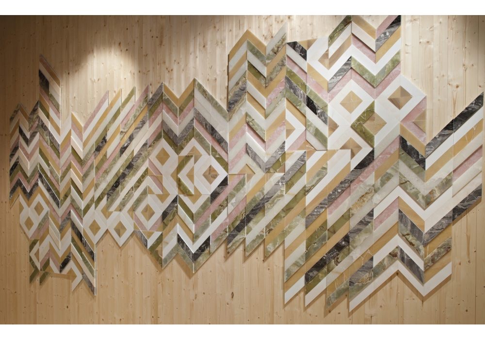 Fishbone von Patricia Urquiola für Budri entworfen, ist ein dekoratives Wandplatte aus edlem Marmor und Onyxen wie Onice Pink, Onice Bianco, Onice Nuvolato, Onyx Pakistan, Grigio Orobico und Bianco Lasa.