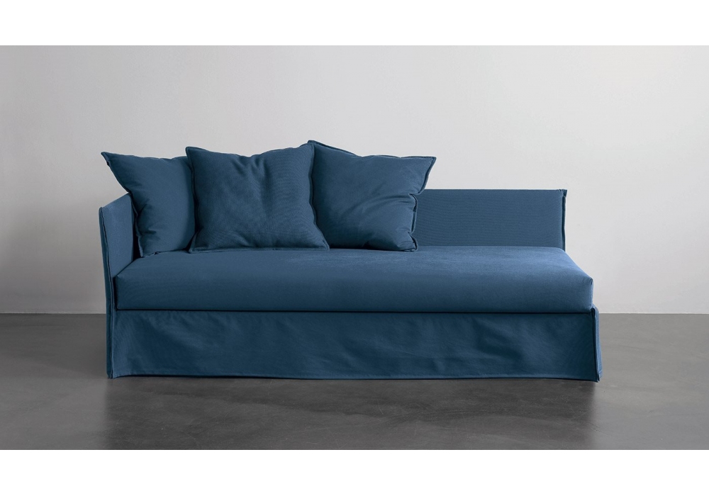 Fox, von Andrea Parisio für Meridiani entworfen, ist ein Daybed mit integriertem Lattenrost und gepolsterten, abziehbaren Holzpaneelen. Sitz-Liege-Matratze, abziehbar, Rückseite Drell, Polsterung aus PU-Schäumen und antiallergischer Polyesterfaserabdeckung.