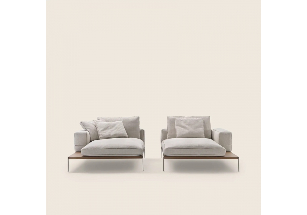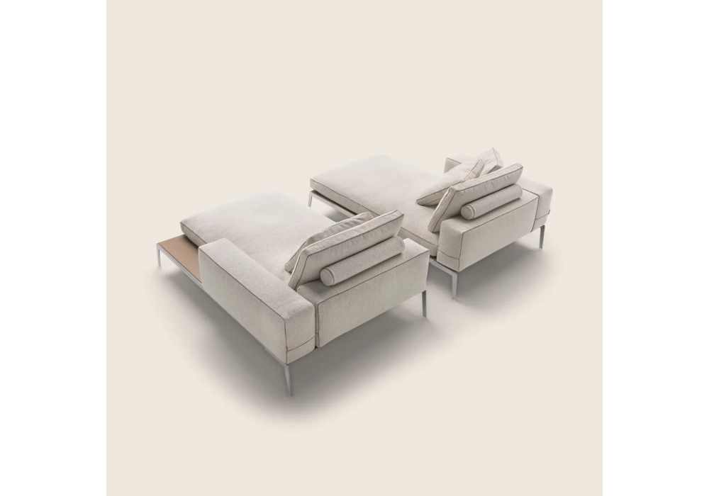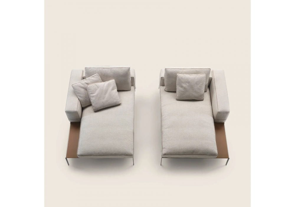 Lifesteel von Antonio Citterio für Flexform entworfen, ist eine Dormeuse aus gepolsterter Metallstruktur aus Leder, Metallbeinen und gepolsterten Sitz- und Rückenkissen mit Gänsedaunen. Die Dormeuse ist mit Leder- oder Stoffbezügen erhältlich.