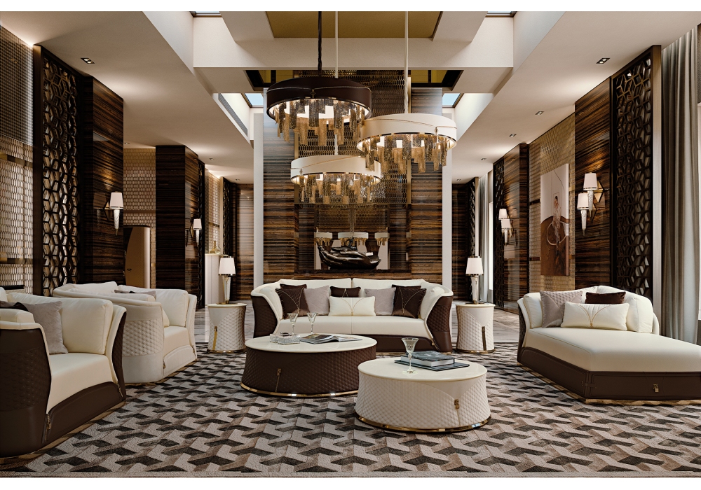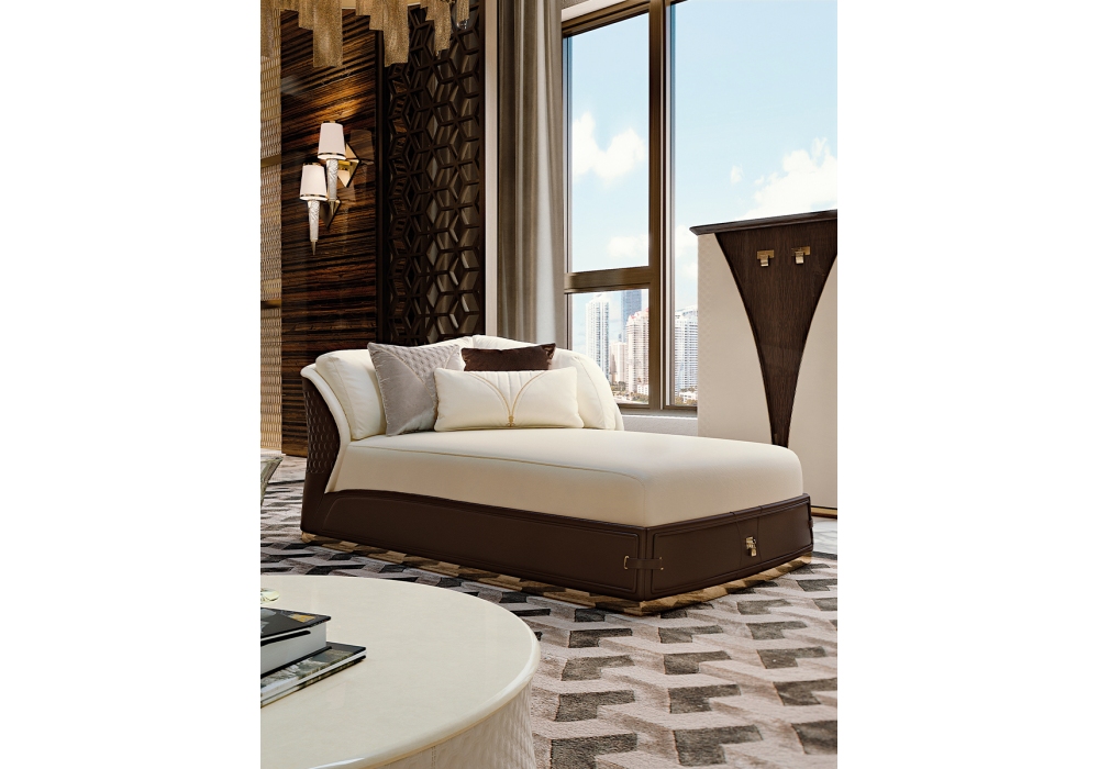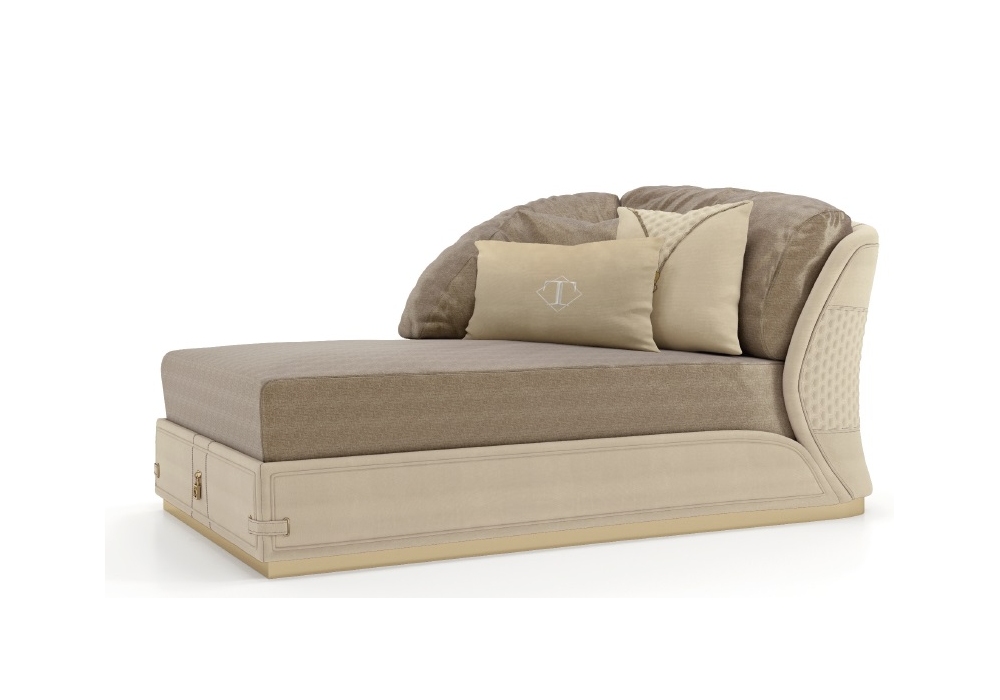 Vogue von Andrea Bonini für Turri entworfen, ist ein Dormeuse mit einer Struktur aus Massivholz und Sperrholz, die mit Polyurethanschaum mit mehreren Dichten gepolstert ist. Schale aus Leder mit Hexagon-Stickerei und Kissen aus verschiedenen Ledern oder Stoffen. Basis und dekorative Details aus goldenem Metall. Verfügbar in rechter oder linker Ausführung.