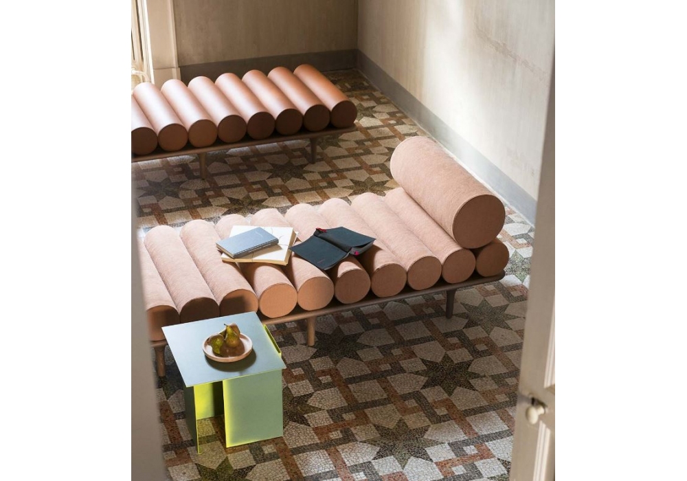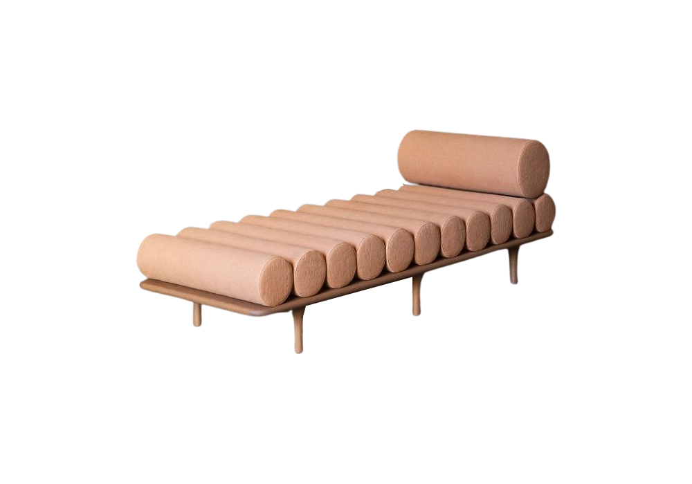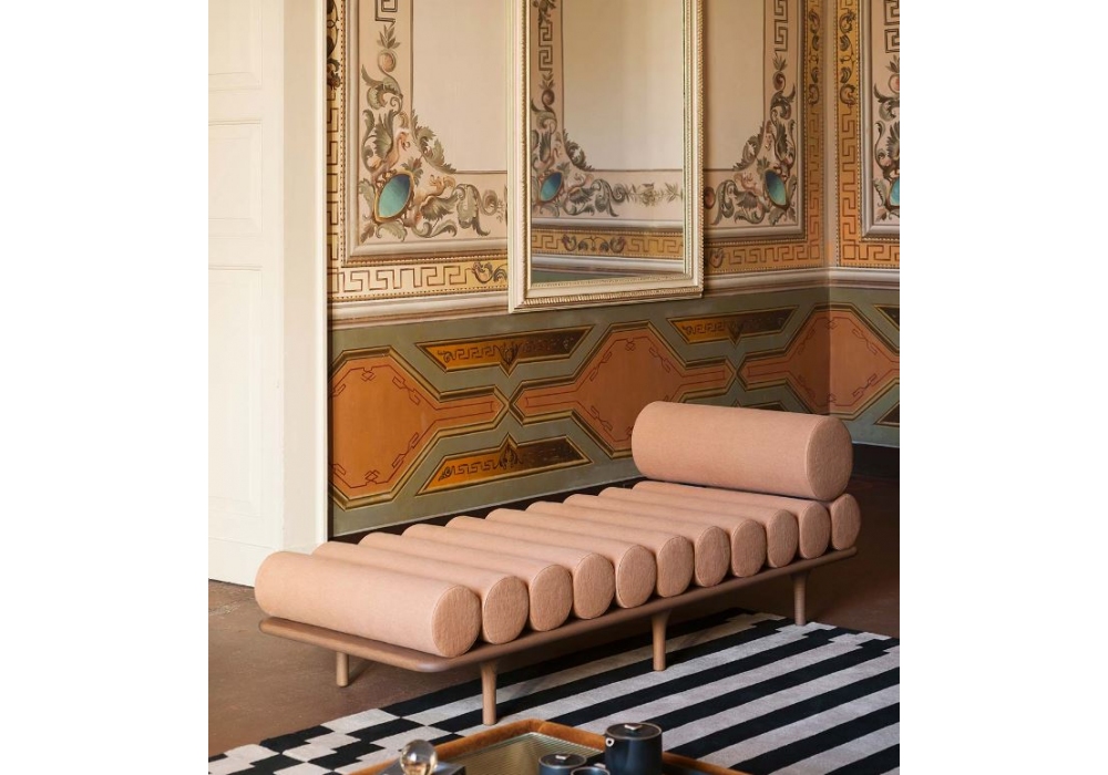 Five to Nine Wool, von Studiopepe für Tacchini entworfen, ist ein Tagesbett mit Untergestell aus Eschenholz, verfügbar in 2 Ausführungen, bestehend aus Rollkissen mit Stoffbezug in verschiedenen Farben. Die Innenpolsterung besteht aus Brianza-Wolle.