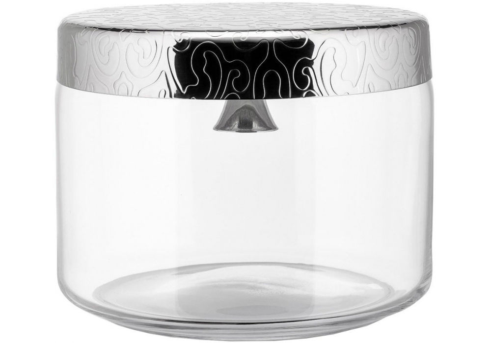 Dressed von Marcel Wanders für Alessi entworfen, ist eine Keksdose aus Glas. Deckel aus Edelstahl 18/10 mit Glocke und Reliefdekor.
