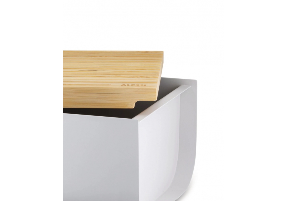 Mattina von Big-Game für Alessi entworfen, ist ein Brotkasten aus harzfarbenem Stahl und Bambusdeckel. Der Deckel ist gleichzeitig ein praktisches Schneidebrett.