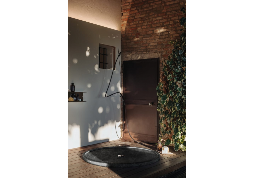 Amuleto von RD Agape für Agape entworfen, ist eine runde Außenduschwanne aus Petit Granit-Marmor. Ausgestattet mit einem Siphon mit verchromter ABS-Ablaufabdeckung.