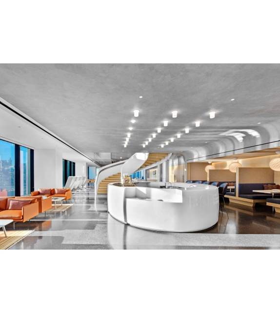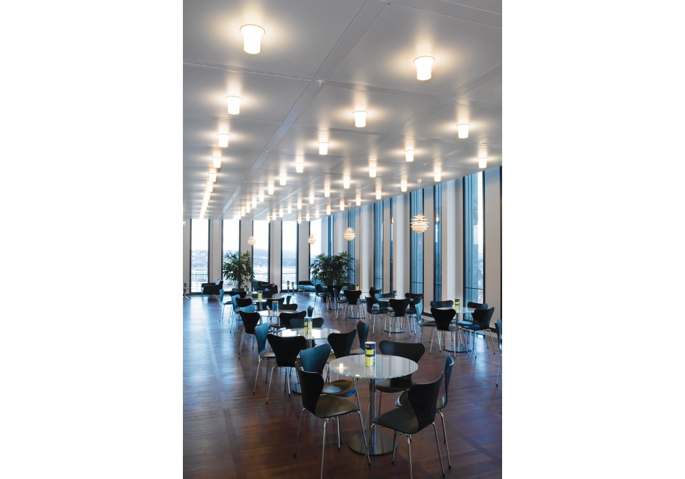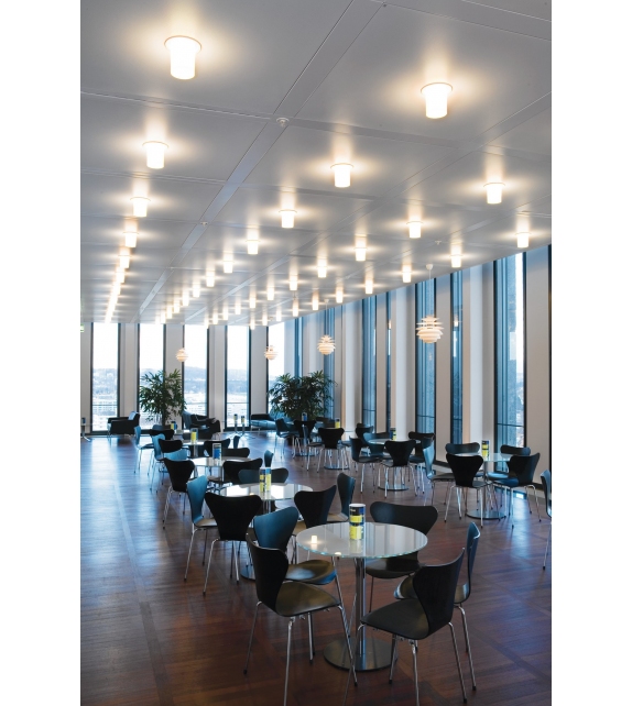 Ballerup von C. J. Nørgaard Pedersen & P. Hougaard Nielsen für Louis Poulsen entworfen, ist eine runde Leuchte, die vollständig aus gezogenem, weiß lackiertem Stahl besteht. Der Diffusor besteht aus opalweißem mundgeblasenem Glas und schirmt eine dimmbare LED-Lichtquelle ab.