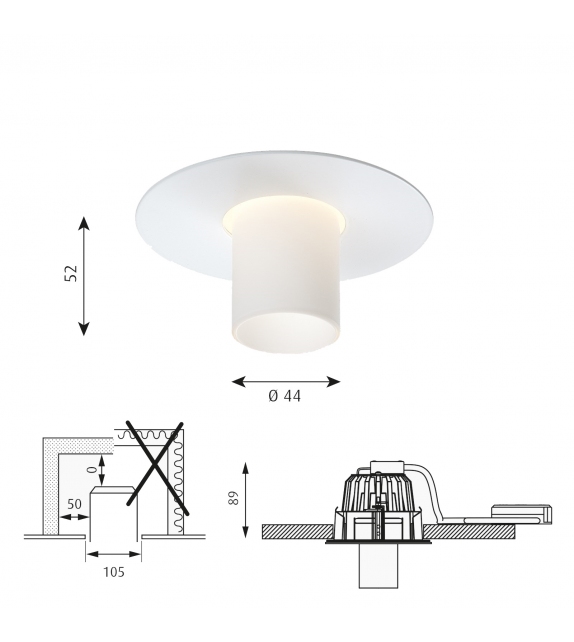 Ballerup Mini von C. J. Nørgaard Pedersen & P. Hougaard Nielsen für Louis Poulsen entworfen, ist eine runde Einbauleuchte mit tragender Struktur aus weiß lackiertem Stahl. Der Diffusor ist aus weißem Opalglas und schirmt eine dimmbare LED-Lichtquelle ab.