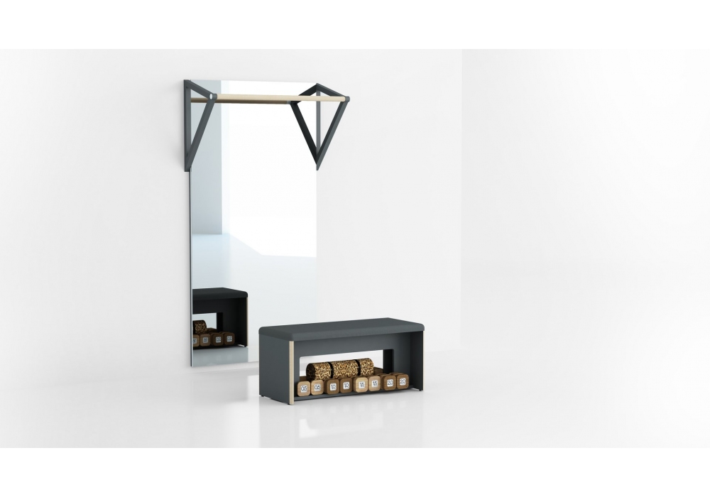 Calipso von Basaglia + Rota Nodari für Fas Pendenza entworfen ist eine viereckige Fitnessbank aus Holz mit gepolstertem Sitz, der mit schwarzem Stoff bezogen ist.