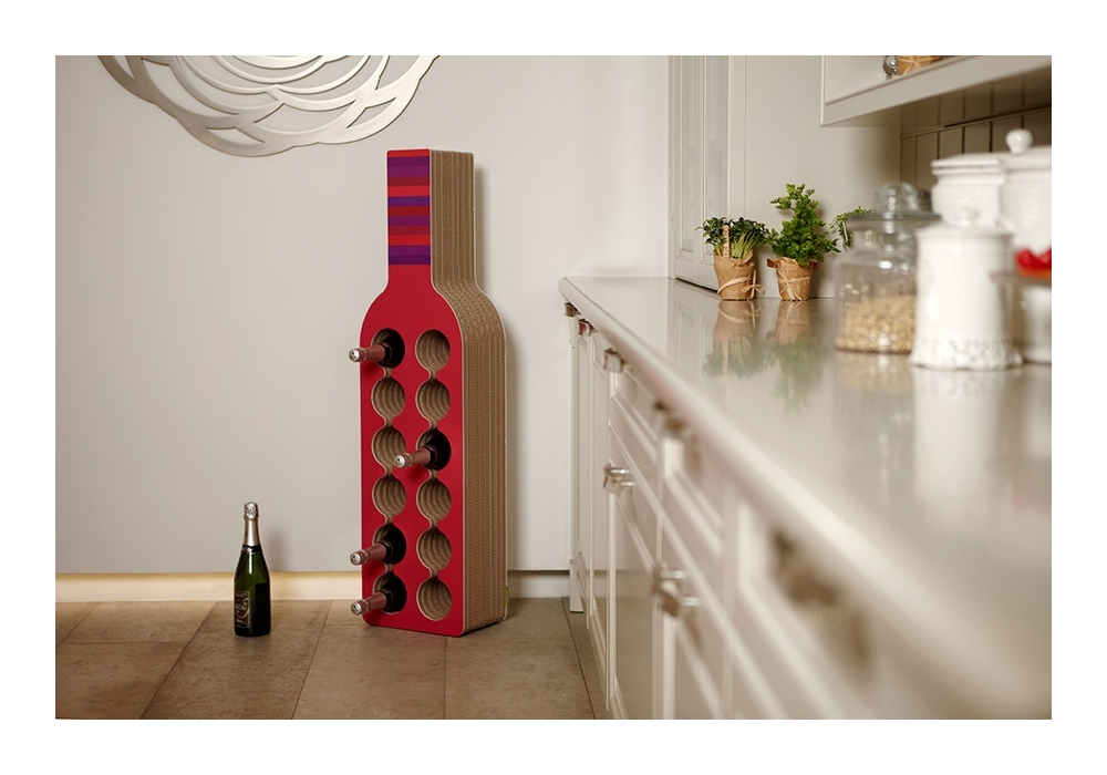 Mini-Bodega designed by Kubedesign is a bottle-shaped wine rack with 12 storage spaces and a shock-proof finish. Available in 3 colours with a striped design.