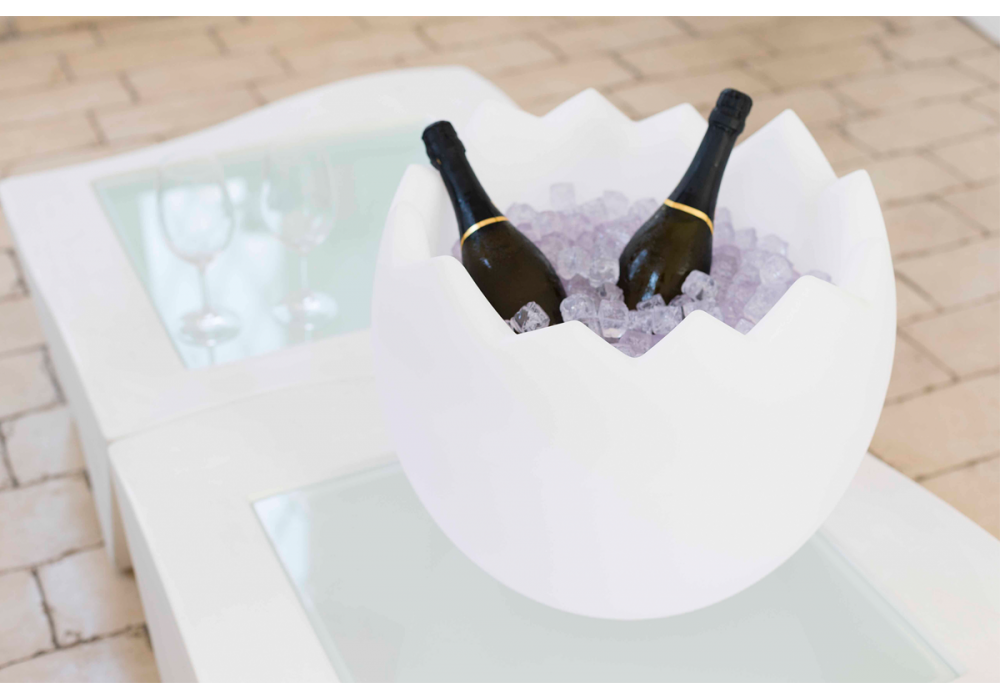 Kalimera, entworfen von Slide Studio für Slide, ist ein Flaschengestell, der an die Schale eines Eies erinnert und ideal ist, um Innen- und Außenbereichen eine informelle Note zu verleihen. Erhältlich in der hellweißen Version oder in verschiedenen Ausführungen
